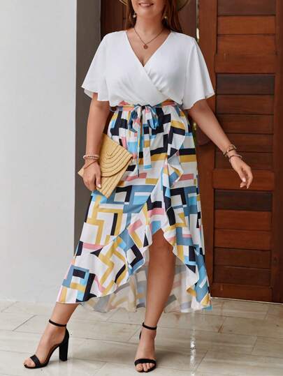 SHEIN Clasi Plus Geo Print Butterfly Sleeve Ruffle Trim Wrap Belted Dress - Multicolor - View 1
