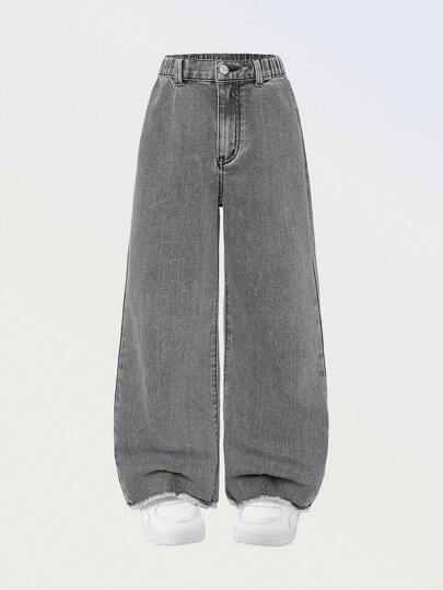 Plus Girls' Casual Basic Comfortable Elegant Fresh Loose Wide Leg College Style Pure White Jeans - Grey - View 1