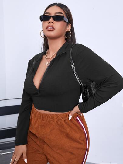 Calvaya Plus Half Zipper Ribbed Knit Crop Tee - Black - View 1