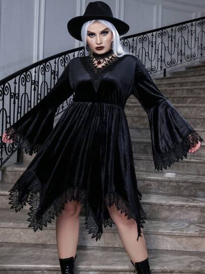 PUNK Plus Halloween Guipure Lace Trim Flare Sleeve Hanky Hem Velvet Dress - Black - View 1