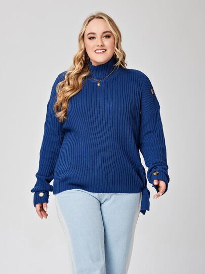 Plus High Neck Drop Shoulder Knot Side Sweater - Blue - View 1