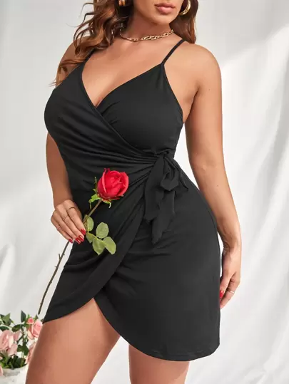Plus Knot Side Wrap Cami Dress - Black - View 1