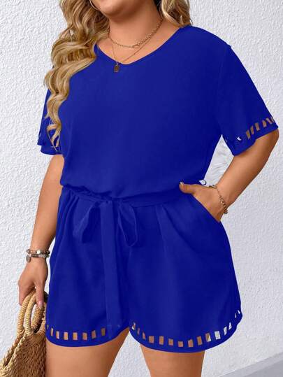 SHEIN LUNE Plus Laser Cut Out Belted Romper - Royal Blue - View 1