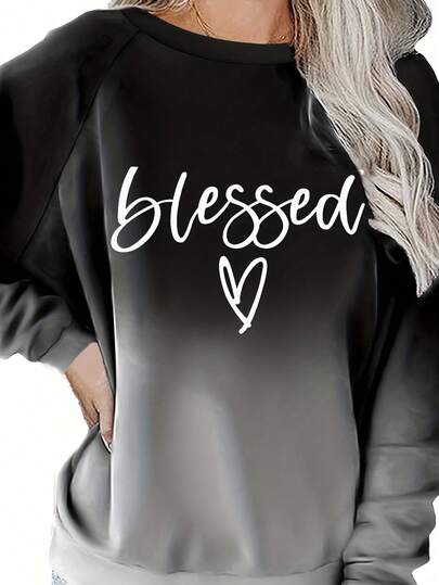 Plus Letter Graphic Ombre Raglan Sleeve Sweatshirt - Black - View 1