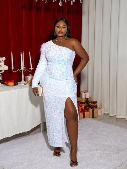 Plus One Shoulder Split Thigh Sequins Dress - White - View 1