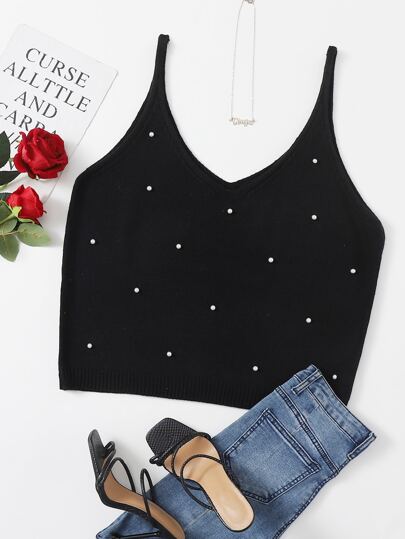 Plus Pearls Beaded Cami Knit Top - Black - View 1