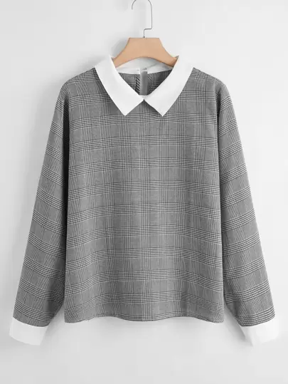 Plus Plaid Contrast Collar Keyhole Back Blouse - Grey - View 1