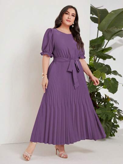 Modelyn Plus Puff Sleeve Pleated Hem Belted Dress - Purple - View 1