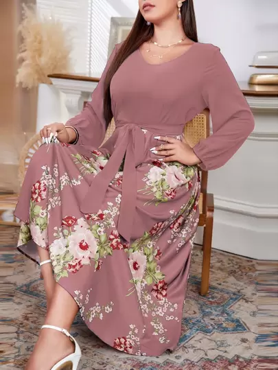 Mulvari Plus Random Floral Print Lantern Sleeve Knot Front Dress Maxi Women Outfit - Dusty Pink - View 1