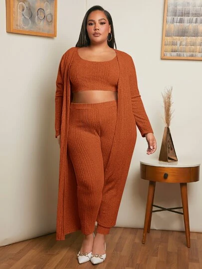 SHEIN CURVE+ Plus Ribbed Knit Crop Tank Top & Leggings & Coat - Rust Brown - View 1