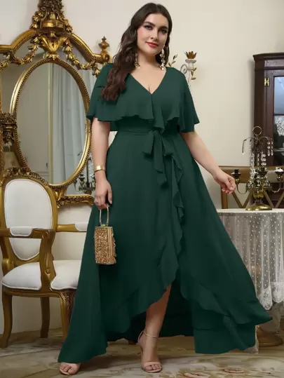 Plus Self Tie Ruffle Wrap Chiffon Dress - Dark Green - View 1