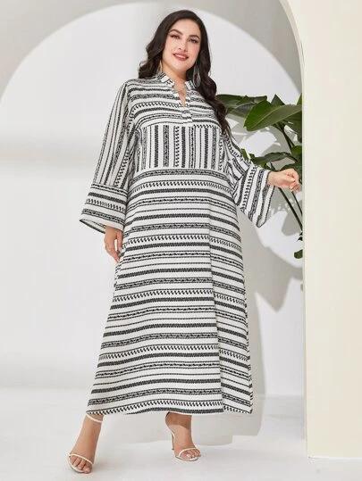 Al Najma Plus Geo Print Notched Neckline Trumpet Sleeve Dress - Black and White - View 1