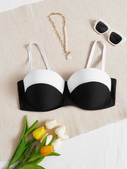 SHEIN Swim Curve Summer Beach Plus Color Block Push Up Bikini Top - Black and White - View 1