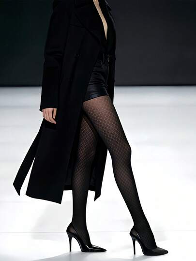 Plus Size Black Check Tights - All-Season Elegant Pantyhose For Office, Party & Casual, High Stretch & Versatile Classic Print - Black - View 9