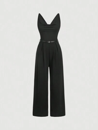 SHEIN MOD Plus Size Black Elegant Draped Neck Belted Wide Leg Jumpsuit, Commuter Wear - Black - View 1