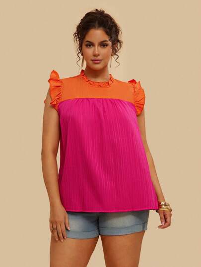 SHEIN VCAY Plus Size Boho Two Tone Ruffle Trim Frill Neck Blouse, For Summer - Multicolor - View 1
