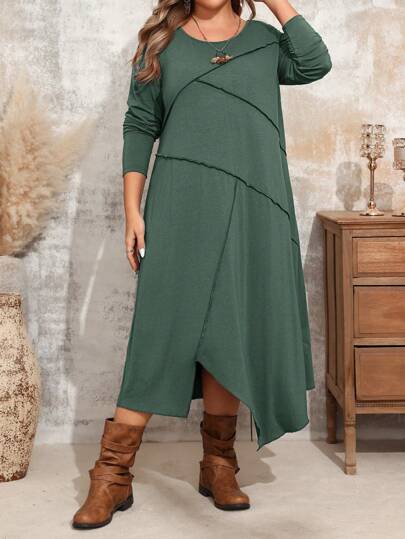 EMERY ROSE Plus Size Casual Round Neck Long Sleeve Fashionable Comfortable Fall Christmas Dress,Winter Clothes For Women - Dark Green - View 1