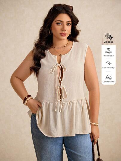 Elaquor Plus Size Casual Soft Sleeveless Pullover Top With Ribbon Details - Apricot - View 1