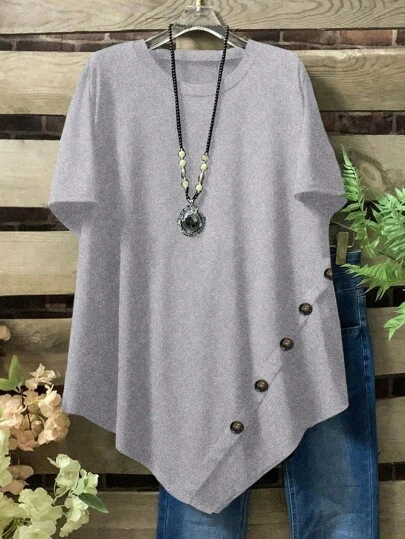Plus Size Casual Solid Color Asymmetrical Hem T-Shirt - Light Grey - View 1