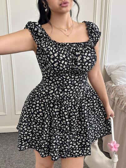 CovetEZ Plus Size Ditsy Floral Casual Romper, Spring/Summer - Multicolor - View 1
