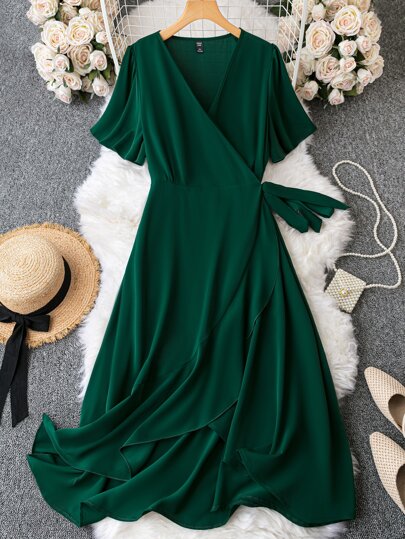 DreamSkyne Exquisite & Elegant  Plus Solid Knot Side Wrap Dress, Women Outfit - Dark Green - View 1