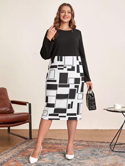 EMERY ROSE Plus Geo Print Dress - Black and White - View 1