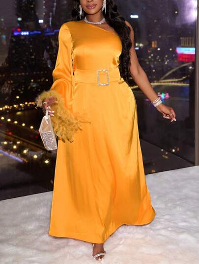 Slaydiva Plus Size Elegant Asymmetrical Shoulder Ruched Waist A-Line Dress - Z - Orange - View 1