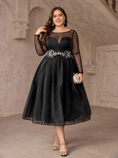 SHEIN Belle Plus Size Elegant Sheer Mesh Long Sleeve Round Neck Patchwork Waist Embroidery Applique A-Line Easter Graduation Season Cocktail Dresses, Semi Formal Dress - Black - View 1