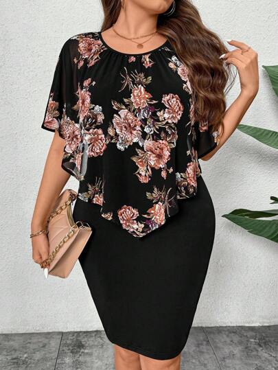 SHEIN Clasi Plus Size Fashionable Romantic Floral Asymmetrical Ruffle Hem Bodycon Solid Color Dress - Multicolor - View 1