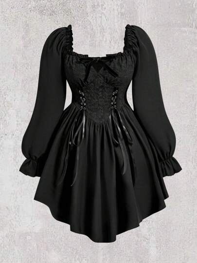 Sweetra Plus Size Jacquard Cross Lace-up Ruffle Sleeve Dress - Black - View 1
