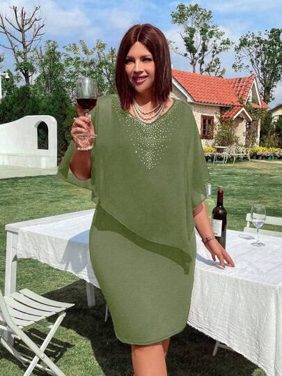 Plus Size Knit Chiffon Inset Rhinestones V-Neck Short Sleeve Fitted Bodycon Dress - Green - View 1