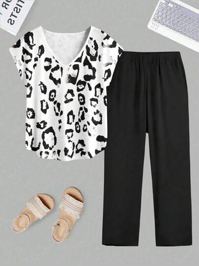 Plus Size Leopard Print Batwing Sleeve Top & Solid Color Pants Two Pieces Set - Multicolor - View 1