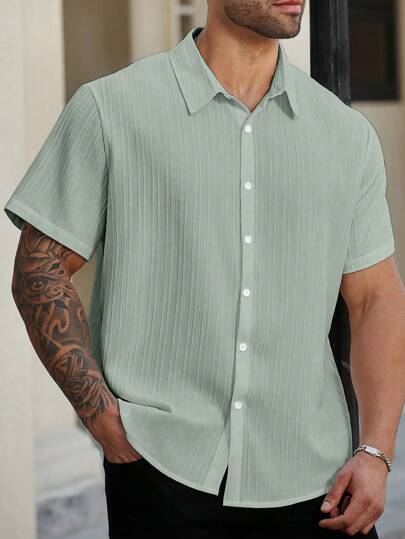 Manfinity Homme Plus Size Men's Solid Color Short Sleeve Single-Breasted Casual Commuter Shirt, Light Green Shirt Men, Men Shirts Short Sleeve Color Green, Men Greem Shirt - Green - View 1