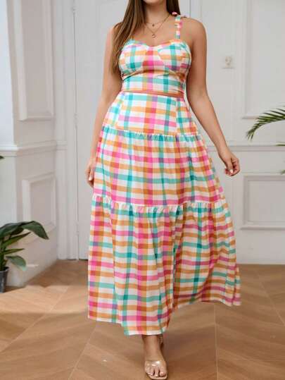 SHEIN Essnce Plus Size Multicolored Plaid Camisole Top With Ruffle Hem Skirt Two-Piece Set - Multicolor - View 1