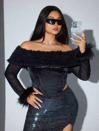 SHEIN ICON Plus Size Off-Shoulder Fluffy Trim T-Shirt - Black - View 1