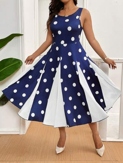 Celure Plus Size Polka Dot Patchwork Sleeveless Round Neck Casual Party Dress For Summer - Multicolor - View 1