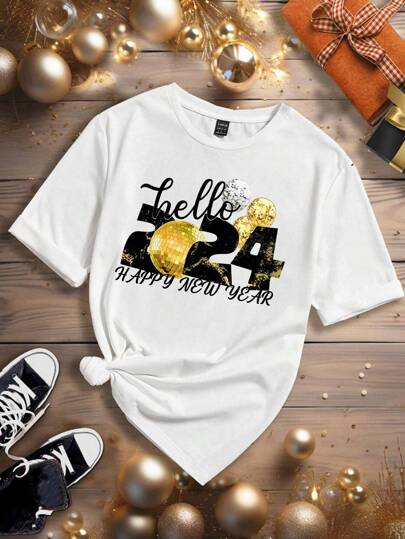 SHEIN LUNE Plus Size Printed Round Neck Short Sleeve T-shirt - White - View 1