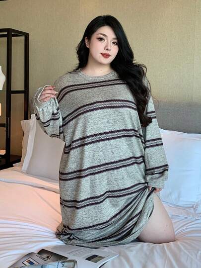 Dazy Plus Plus Size Round Neck Striped Long Sleeve Loose Straight Hem Nightgown, All Season Pajama - Camel - View 8