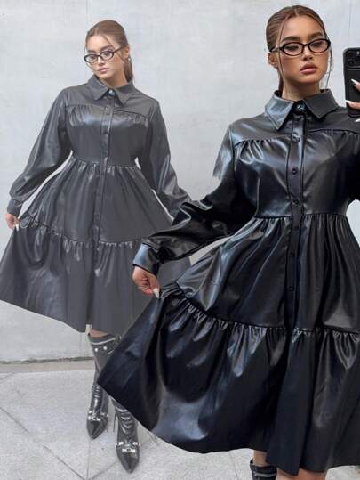 Calvaya Plus Size Shirt Collar Open Front Ruched PU Patchwork Long Sleeve Dress, For Winter - Black - View 1