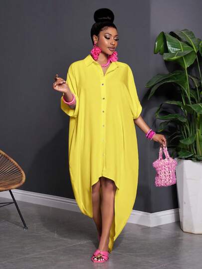 Slaydiva Plus Size Solid Color Long Sleeve Dress, Fashionable For Summer - Yellow - View 1