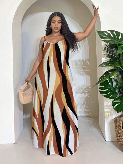 Veslaya Plus Size Striped Print Summer Casual Dress, Suitable For Vacation Flowy Dress Suitable For Going Out Chic Dress - Apricot - View 1