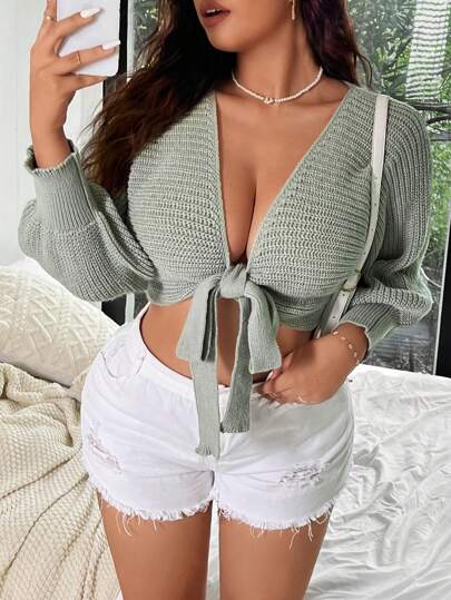 Flirla Plus Size Twisted Tie Long Sleeve Elegant And Gentle Cardigan Sweater Fall Cloth For Women - Green - View 1