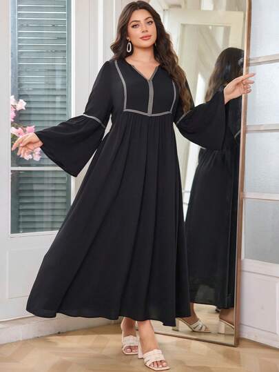 Plus Size V-Neck Flare Sleeve Splice Woven Belt Robe - Black - View 1