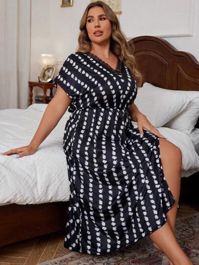 Plus Size V-Neck Patchwork Ruffle Hem Ditsy Floral Nightgown - Black and White - View 1