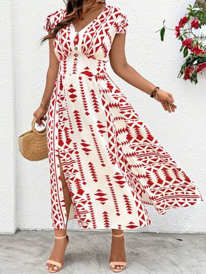 SHEIN Clasi Plus Size Vacation & Casual Geometric Printed Split Dress - Red - View 1