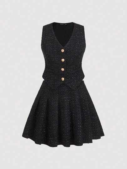 SHEIN MOD Plus Size Vintage Style Casual Button-Front Sleeveless Blazer Vest & Pleated Mini Skirt 2Pcs Set, For Winter - Black - View 1