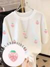 Resyla Women's Fashion Casual Drop Shoulder Round Neck T-Shirt, Strawberry Embroidered T-Shirt, Strawberry Towel Embroidered T-Shirt, Casual Comfortable Outdoor T-Shirt, All Season T-Shirt, Fruit T-Shirt