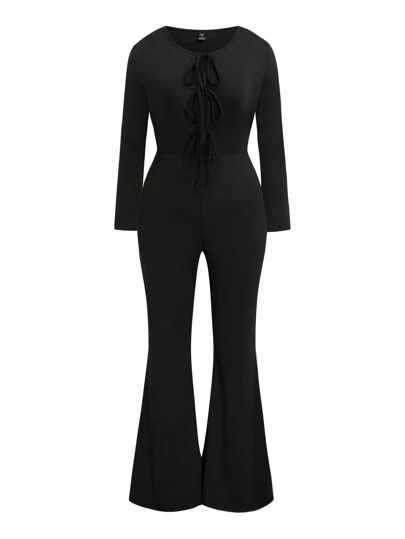 SHEIN Clasi Plus Size Women's Casual Black Knitting Tie Waist Bodycon Flared Jumpsuit, Autumn - Black - View 1