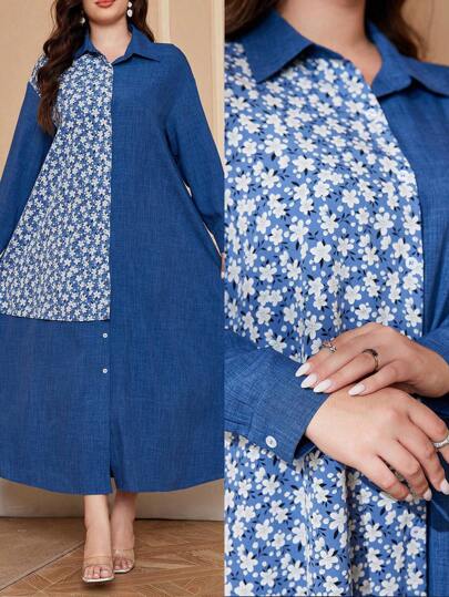 Al Najma Plus Size Women's Floral Print Long Sleeve Single-Breasted Dress, Arabian Style, Casual,Modest For Casual Daily/Travel/Holiday/Vacation/Homewear, Maxi Length Plus Size Arabian Wear - Multicolor - View 1