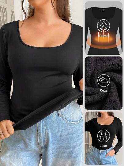 SHEIN EZwear Plus Size Women's Knitted High Elastic Thick Thermal Lined Warm Tight Fit T-Shirt, Autumn/Winter - Black - View 1